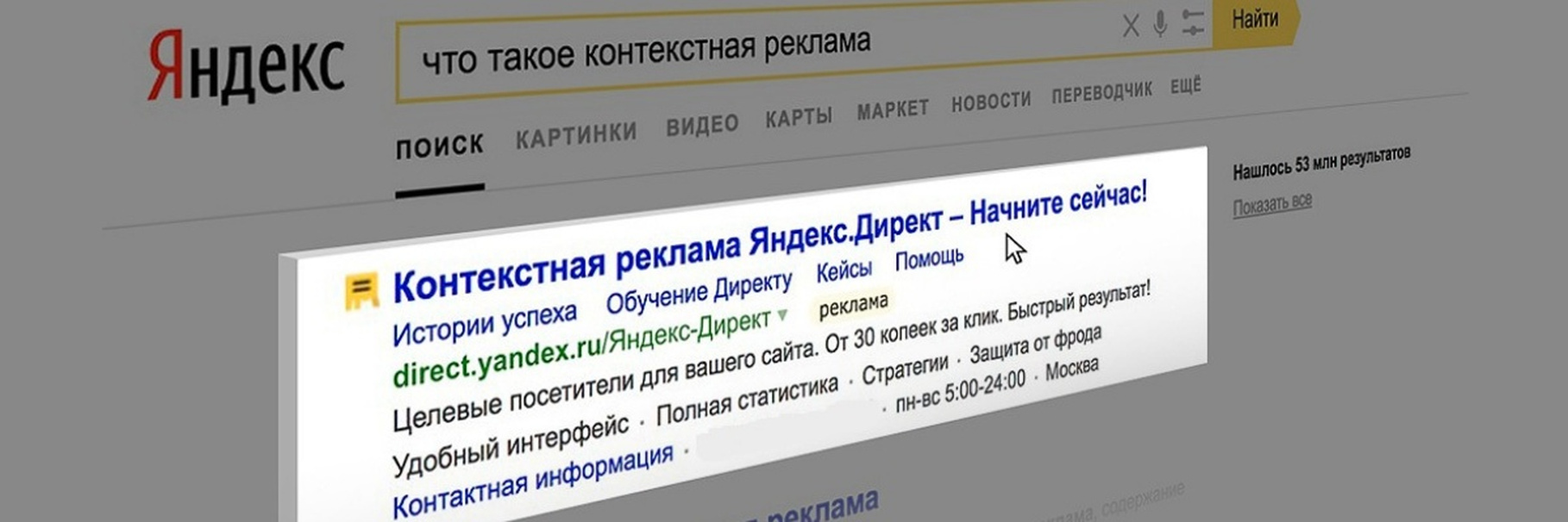 Контекстная реклама в Яндекс Директ — это показ ваших рекламных объявлений точно в тот момент, когда человек ищет услуги. С ее помощью объявления показываются в поиске Яндекса на первых четырёх строчках по конкретному поисковому запросу пользователя.